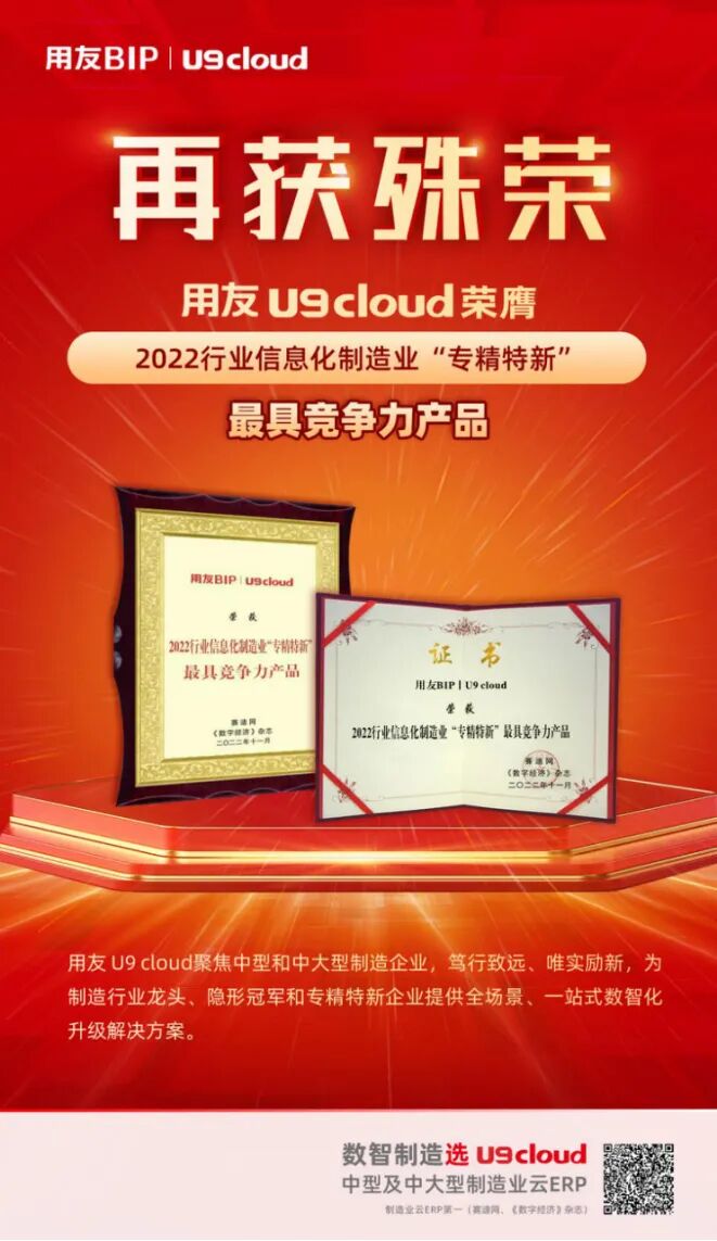 凭借在众多制造企业的成功应用,用友U9 cloud先后荣获2022年中国制造业云ERP状元奖、2022行业信息化制造业“专精特新”最具竞争力产品、2022新基建中型及中大型制造业云ERP首选品牌等一系列奖项,成为制造企业数智化转型的首选品牌。